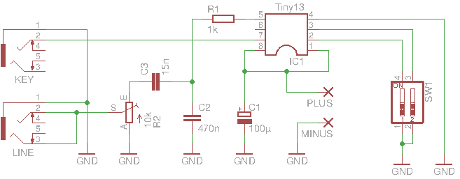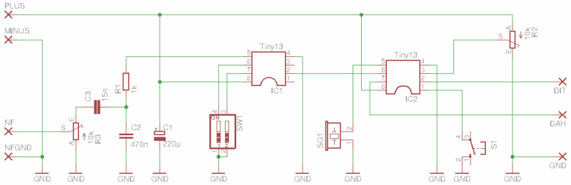 Der rechte ATtiny13 arbeitet als primitiver CW-Keyer. Neben den Anschlüssen für das Paddle gibt es nur einen Geschwindigkeits-Einsteller, einen Reset-Taster und einen optionalen Piezo-Buzzer SG1, der die Morsegeschwindigkeit in WPM (Worte pro Minute) unmittelbar nach einem Reset ausgibt. Das Telegrafie-Tast-Signal wird an Pin 8 ausgegeben.