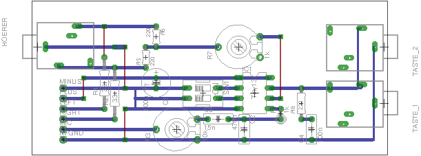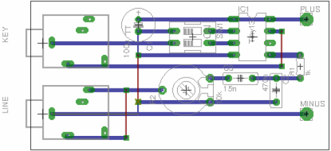 Als Option sind eine zweite Tastenbuchse und das RC-Glied R8/C4 eingezeichnet, falls man zwei Tasten anschliessen möchte und mindestens eine davon eine Handtaste ist, deren Kontakt etwas prellen könnte. Für einen Elbug ist das RC-Glied nicht sinnvoll.
