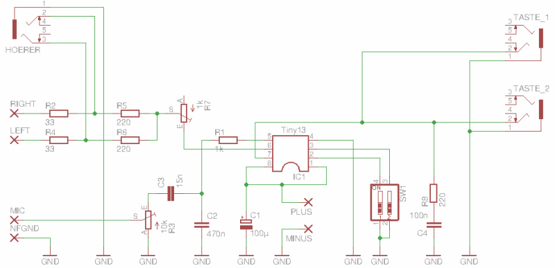 Der linke ATtiny13 erhält das Tastsignal an Pin 2 zugeführt. An den Pins 6 und 7 liegt ein "Mäuse-Klavier", mit dem man die Tonhöhe in vier Stufen umschalten kann. An Pin 5 wird ein pulsweiten-moduliertes Rechtecksignal ausgegeben (37,5 kHz Schaltfrequenz). Mit einem einfachen Bandpass aus R1, C2, C3 und R3 wird daraus ein halbwegs gesäuberter Sinus. Der Ausgangs-Pegel ist für einen Soundkarten-Line-In-Eingang dimensioniert. Für einen Notebook-Mikrofon-Eingang ist der Pegel etwas zu hoch; man kann erforderlichenfalls zu R3 einen 1 kOhm-Widerstand parallel schalten oder R3 durch einen 1 kOhm-Trimmer ersetzen.