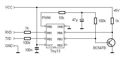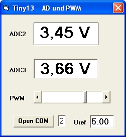 Der ATtiny13 bietet sich als universelles Messgerät an, wobei die Auflösung von 10 Bit den Spannungsbereich zwischen 0 V und 5 V in 1023 Stufen teilt. Das hier vorgestellte Anwenderprogramm ermöglicht zugleich die Ausgabe eines PWM-Signals, das in 255 Stufen aufgelöst ist.