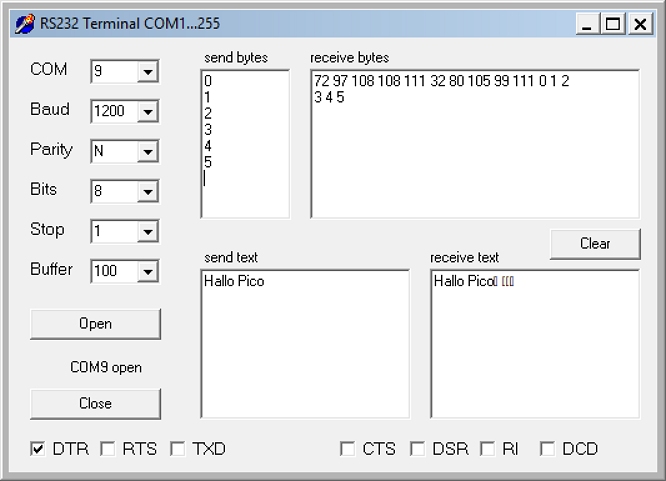 Schnittstelle mit 1200 Baud geschlossen. Dann geht der Pico in seinen