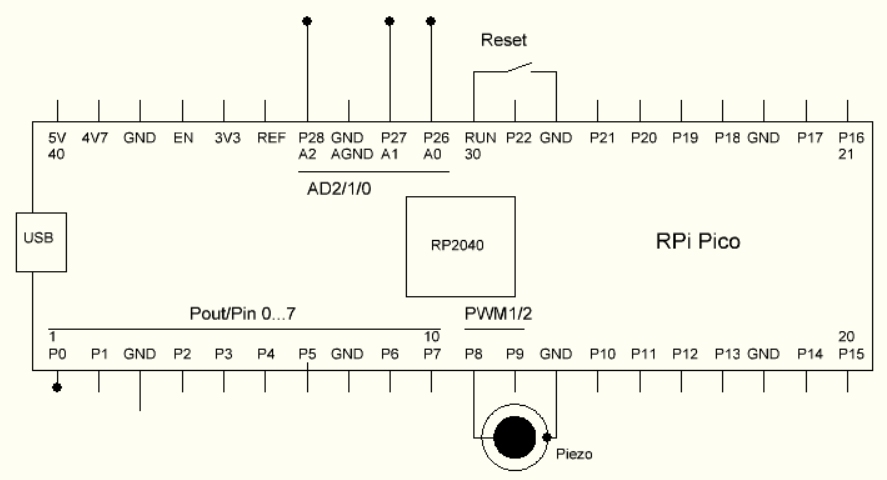 Deshalb ist der Piezo-Lautsprecher hier am PWM-Ausgang angeschlossen.