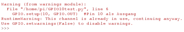 Hinweis, was zu tun ist. GPIO.setwarnings(False) sollte die Warnungen