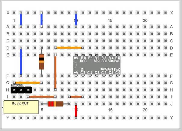 Der folgende Schaltplan (Bild 2) zeigt den Minimalaufbau für ein Bredboard (ohne angeschlossene Peripherie). Mit dem PICAXE Electronic Bredboard Layout Emulator „PEBBLE“ (kostenloser Download über PICAXE.com) kann der Aufbau auf dem Bredboard grafisch am PC erstellt werden.