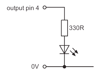 Der Schaltungsvorschlag zur Ansteuerung der LED’ s findet man im „PICAXE Manual 1“. Ich bevorzuge die Variante die logische „1“ zu schalten. Zum Setzen eines Ausganges kann der Befehl „high“ und zum Löschen „low“ verwendet werden. Mit „high 4“ wird der „output pin 4“ gesetzt, mit „low 4“ rückgesetzt. Der Output Pin ist jedoch nicht identisch mit dem Ausgangsport am IC. Es empfiehlt sich die Ausgänge im Simulator (siehe unten) zu überprüfen. Eine genauere und empfohlene Variante ist die Verwendung des Befehls mit dem genauen Port-Namen. Für den Output Pin 4 wäre dies zum Setzen der Befehl „high B.4“ und zum Löschen „low B.4“. Die Entwickler des PICAXE schlagen einen 330 Ohm-Vorwiderstand zur Ansteuerung einer LED vor (Bild 3). Wer keinen 330 Ohm Widerstand zur Hand hat, kann z.B. auch einen 1K Widerstand, wie er beim MSR-USB-Lernpaket des Franzis-Verlags beiliegt, verwenden.