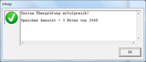 Wir haben noch keinen Code geschrieben, jedoch ergibt ein leerer Code bei der Syntax-Prüfung eine Nutzung von 3 Bytes der 2048 Programm-Bytes des PICAXE 08M2 (Bild 7).