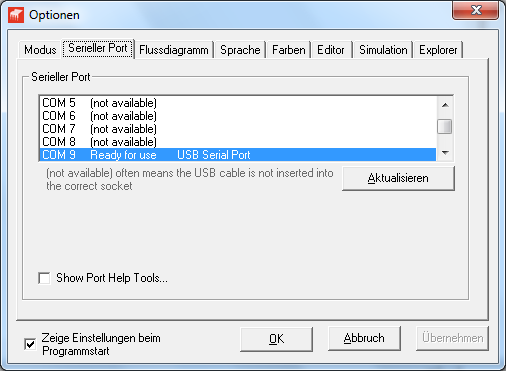 Mit einem Klick auf „Stop Simulation“ beenden sie die Simulation. Die Simulationsfenster bleiben noch sichtbar. Sie verschwinden, sobald sie einen neuen Code schreiben oder auf die Syntax – Überprüfung klicken. Man kann die Simulationsfenster auch mit klicken auf „Stop“ automatisch verschwinden lassen, dazu muss man unter „Optionen“ die Registerkarte „Simulation“ anwählen und den Haken bei „Automatically hide panels…“ setzten!