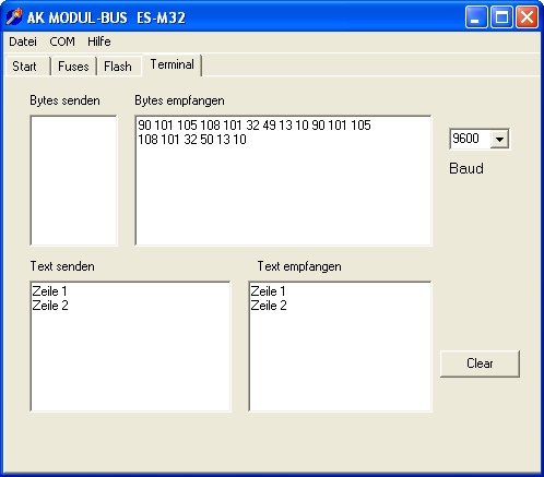 Einstellung der Baudrate können Einzelbytes oder Textzeichen gesendet und