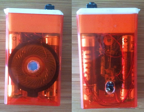Als Antenne dient eine Drahtschleife mit zwei Windungen im Inneren des Gehäuses. Dank der großen Empfindlichkeit reicht diese Antenne für das Radio im Normalfall aus. Die Betriebsspannung wird mti einem zusätzlichen Elko von 100 µF gestützt, weil die verwendete Batterie einen relativ großen Innenwiderstand hat.