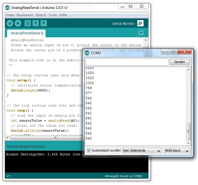 Der Sketch AnalogReadSerial.ino aus der Arduino-Software funktioniert ohne Änderung,
