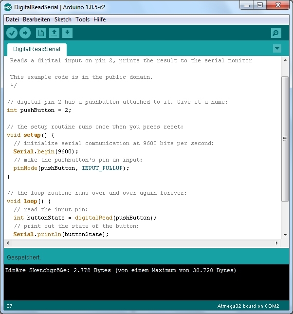 Der Sketch DigitalReadSerial.ino fragt einen Schalter am Pin