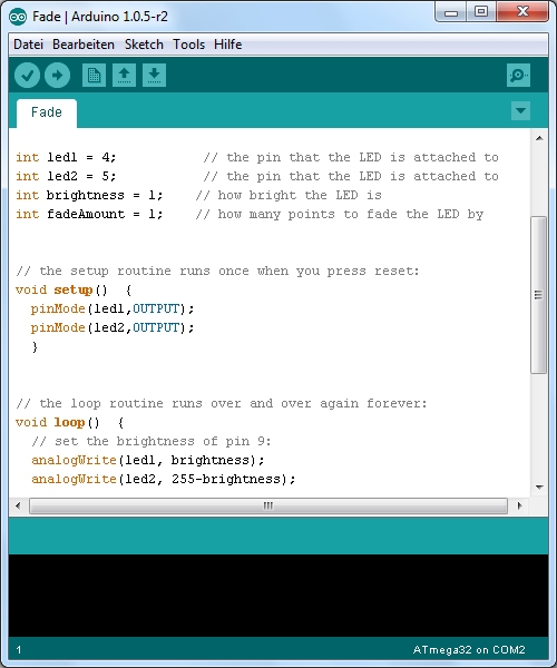 ursprüngliche Beispiel Fade.ino wurde auf zwei LEDs erweitert und
