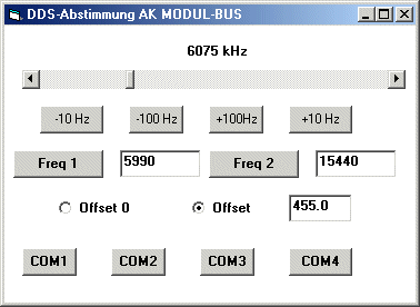 Die Frequenz kann wahlweise über den Schieberegler eingestellt werden oder über eines der beiden Textfenster als Frequenz 1 oder Frequenz 2 direkt eingetippt uns ausgewählt werden. Wahlweise kann ein Offset von 455 kHz gewählt werden, um einen Empfänger mit der Zwischenfrequenz 455 kHz zu steuern. Die Platine ist kompatibel zum Elektor DRM-Empfänger. Ein Eigenbaugerät mit der ZF 455 kHz kann daher auch direkt über DREAM abgestimmt werden. Umgekehrt kann auch der Elektor-Empfänger mit dem Programm DDS.EXE angesteuert werden.