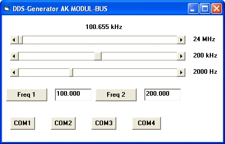 Die bisherige DDS-Software war speziell für den Einsatz in Kurwellenempfängern ausgelegt. Der DDS-Generator eignet sich jedoch auch für Messzwecke z.B. im NF-Bereich ab 1 Hz. Damit nun auch kleinere Frequenzen mit hoher Auflösung eingestellt werden können wurde eine neue Software geschrieben. Die Frequenz wird nun über drei Schieberegler mit unterschiedlicher Auflösung eingestellt. Der untere Regler hat eine Auflösung von 1 Hz. Die Ausgangsfrequenz ist die Summe aller drei eingestellten Frequenzen. Damit hat man sowohl den vollen Arbeitsbereich als auch eine hohe Auflösung.
