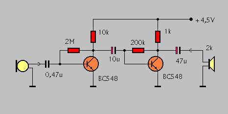 Für einen Mikrofonverstärker reicht oft eine einzelne Verstärkerstufe nicht aus. Für praktische Versuche mit einem dynamischen Mikrofon und einem Kopfhörer von z.B. 600 Ohm oder 2 kOhm lässt sich ein einfacher Verstärker mit zwei Stufen aufbauen. |