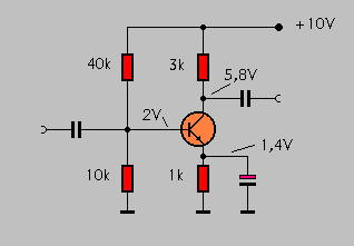 Die Schaltung verwendet eine starke Spannungs-Gegenkopplung. Eine relativ kleine Änderung der Emitterspannung wirkt sich direkt auf die Basis-Emitterspannung aus und führt aufgrund der steilen Basis-Kennlinie zu einer starken Änderung des Kollektor- und Emitterstroms. Da nur sehr kleine Änderungen der Basis-Emitterspannung nötig sind, stellt sich die Emitterspannung auf einen Wert ein, der um ca. 0,6 V unter der Basisspannung liegt. Die Funktion ähnelt der des sog. Emitterfolgers (auch: Kollektorschaltung). Die starke Gegenkopplung führt zu einer sehr geringen Spannungsverstärkung. Damit die Verstärkung für NF-Signale hoch genug ist, wird die Gegenkopplung durch einen Emitterkondensator aufgehoben. Sein Wert richtet sich nach der tiefsten zu verarbeitenden Frequenz (Hochpass). |