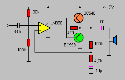 Mit OPVs lassen sich auch Lautsprecherverstärker aufbauen. Zwar ist der maximale Ausgangsstrom mit ca. 10 mA nur für einfache Kopfhörerverstärker geeignet, mit zwei zusätzlichen Transistoren ergibt sich jedoch immer noch ein einfacher Aufbau. Die Transistoren bilden eine Gegentaktendstufe mit dem Ruhestrom Null. Kleine Signale werden direkt vom OPV geliefert. Erst bei Ausgangsströmen über 10 mA beginnen die Endstufenstransistoren zu verstärken.