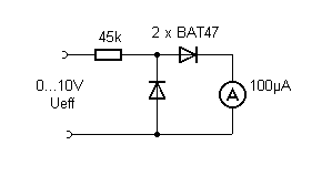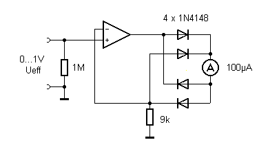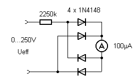 Zur Messung von Wechselspannungen und Wechselströmen müssen diese zunächst gleichgerichtet werden. Prinzipiell kann dazu ein üblicher Vierweggleichrichter eingesetzt werden. Problematisch ist dabei allerdings das Verhalten bei kleinen Spannungen. Jede Diodenkennlinie zeichnet sich durch einen deutlichen Knick bei der Durchlassspannung aus. Auch bei kleinen Strömen gehen so an einer Si-Diode mindestens 0,5 V verloren. Unterhalb dieser Spannung ist keine Gleichrichtung möglich. Mit einem Vierweggleichrichter ergibt sich ein Spannungsabfall von etwa 1 V. Der Einsatz ist daher nur bei der Messung sehr hoher Spannungen sinnvoll. Bei einem Messbereich bis 250 V ist der Fehler durch den Gleichrichter tolerierbar. Hier eine typische Messschaltung: |