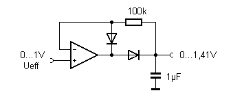 | Ein Nachteil der Gleichrichterschaltung ist, dass die Ausgangsspannung nicht gegen Masse erscheint, sondern nur mit einem schwimmenden Potential am Messwerk liegt. Die folgende Schaltung zeigt einen Messgleichrichter, dessen Ausgangsspannung auf Masse bezogen ist und damit leicht weiterverarbeitet werden kann. Am Ausgang steht nicht eine gemittelte Spannung, sondern die gleichgerichtete Spitzenspannung. Bei einer Sinusspannung am Eingang mit Ueff = 1 V erscheint also eine Gleichspannung von 1,41 V am Ausgang. Im Prinzip besteht die Schaltung aus einem Einweggleichrichter mit Ladekondensator. Am Ausgang des OPV liegt nur dann eine positive Spannung, wenn die Spannung am Eingang gerade über der Ladespannung des Kondensators liegt. Der Einweggleichrichter leitet also nur in den kurzen Momenten der Spannungsspitzen. Eine zweite Diode verhindert, dass der OPV in der übrigen Zeit zu weit in den negativen Bereich aussteuert und dabei in die Sättigung kommt, was seine Ansprechzeit verschlechtern würde. |