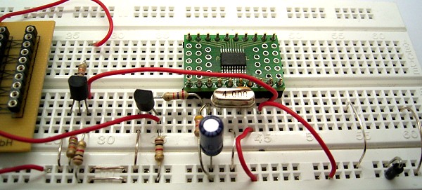 Der Versuch wurde hier auf einer Steckplatine aufgebaut. Die Elexs-Platine dient zum Anschluss an ein Schnittstellenkabel. Rechts unten wird die Betriebsspannung zugeführt. Als kleine Sicherheitsmaßnahme gegen Verpolung wurde außerdem eine parallele Diode an die Betriebsspannung gelegt.