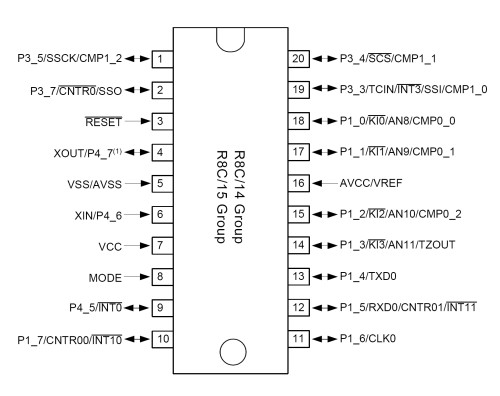Der R5F21154SP ist ein 16-Bit-Mikrocontroller mit internem 8-Bit-Datenbus aus der R8C-Familie von Renesas. Eine Besonderheit des Controllers ist die serielle Debug-Schnittstelle. Der Anwender benötigt kein spezielles Programmiergerät, sondern überträgt Programme über die serielle Schnittstelle. Als Entwicklungswerkzeug stellt Renesas einen kostenfreien C-Compiler mit Windows-Oberfläche zur Verfügung.