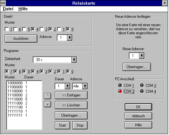 Eine weitere Besonderheit ist die Programmierbarkeit der Karte. Der Anwender kann bis zu 30 Schaltmuster und zugehörige Zeiten einprogrammieren, die dann autonom, also ohne angeschlossenen PC ablaufen. Dabei sind Schaltzeiten im Bereich von Sekundenbruchteilen bis zu Wochen möglich. Alle Daten werden in einem internen EEPROM permanent gespeichert. Das Gerät eignet sich damit auch für universelle Langzeitsteuerungen.