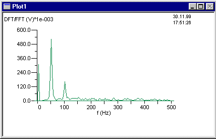 Das Oszillogramm zeigt ein stark gestörtes und unten abgeschnittenes 50-Hz-Signal mit einer Spitzenamplitude von ca. 2 V. Das Signal ist abgeschnitten, weil der Wandler keine negativen Spannungen verarbeitet. Die nachfolgende Abbildung zeigt die Fourier-Analye. Man erkennt eine starke Grundfrequenz von 50 Hz. Außerdem ist eine starke Komponente bei 100 Hz vorhanden, wie es bei einer unsymmetrischen Signalform zu erwarten war. Weitere Obertöne sind im allgemeinen Rauschen nicht mehr eindeutig zu erkennen.