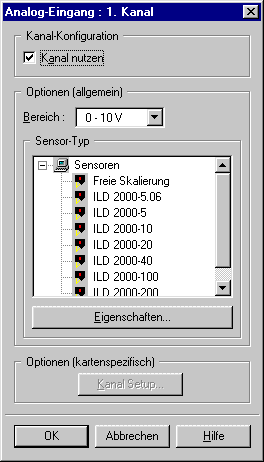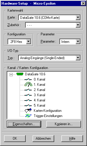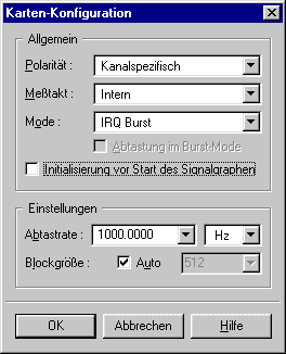 Auch der AD-Wandler hat noch einige interessante Einstellungen. Ein Doppelklick auf den Wandler erlaubt die Veränderung der „Karten-Konfiguratioen“ Abb. 7 zeigt die Standard-Einstellungen. Polarität, Messtakt und Betriebsmodus können bei dieser Karte nicht verändert werden. Man kann aber eine neue Initialisierung vor jedem Start einschalten, um mögliche Störungen des Wandlers zu beheben. Eine solche Störung kann auftreten, wenn jemand im laufenden Betrieb den Wandler von der Schnittstelle entfernt und wieder anfügt.