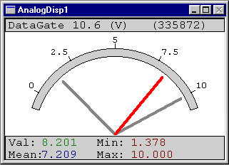 Die analoge Anzeige passt sich automatisch dem Messbereich des Eingangs an und zeigt den aktuellen Eingangszustand als Zeigerstellung und als numerischen Wert (7,209 V). Außerdem gibt es Anzeigen für das verwendete Interface (DataGate 10.6), die insgesamt verstrichene Zeit seit dem Start der Messung (335872 ms), sowie für Minimum, Maximum und Mittelwert der Messwerte im Messzeitraum. Man sieht also, schon dieser ganz einfache Signalgraph liefert eine vollwertig einsetzbare Anwendung.