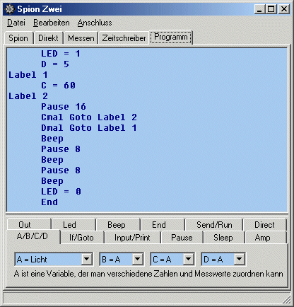 Befehle sind auf einzelnen Registerkarten in Gruppen angeordnet. Hinter der Zeile " A = ...." verbirgt sich wiederum eine Vielzahl möglicher Varianten der Wertzuweisung an die Variable A, die man mit der Maus oder den Cursortasten auswählt. Es können konstante Byte-Werte (A = 100), Messergebnisse (A = Spannung), Inhalte anderer Variablen (A = B) oder Rechendergebnisse (A = A + B) zugewiesen werden. Entscheidend ist, dass Syntaxfehler ausgeschlossen sind, da nichts selbst eingetippt werden muss.