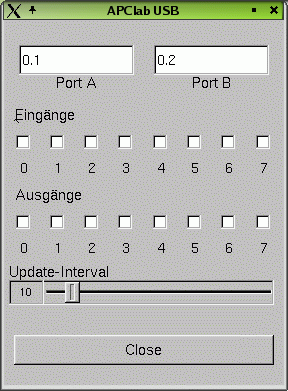 Mit diesem Linux Kernel Modul ist es möglich, die Portzustände der einzelnen Eingabe-Ports 0 -7, die analogen Eingänge A und B sowie die Ausgabe-Ports 0 - 7, zu setzen bzw. auszulesen. Auf der Seite findet man auch alle Einzelheiten zum Einsatz des Moduls.