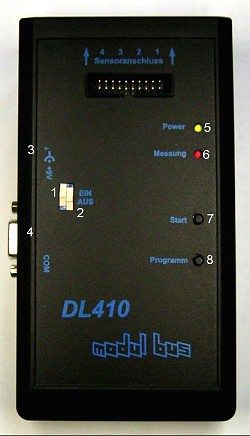 Der Datenlogger DL410 verfügt über vier Sensorkanäle mit einer Auflösung von 10 Bit. Messdaten können in einem internen EEPROM-Speicher von 64 KB gespeichert werden. Das Betriebssystem des Geräts kann über die RS232-Schnittstelle ein Update erhalten bzw. komplett ausgetauscht werden.