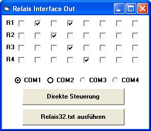 Die Lösung bringt das kleine VB-Programm Relais32.exe. Es erlaubt sowohl eine direkte Steuerung mit der Maus als auch eine Programmierung. Es wird vorausgesetzt, dass bis zu vier Relais-Interfaces mit den Adressen 1, 2, 3 und 4 angeschlossen sind. Es funktioniert aber auch, wenn nur zwei oder drei Interfaces verwendet werden.
