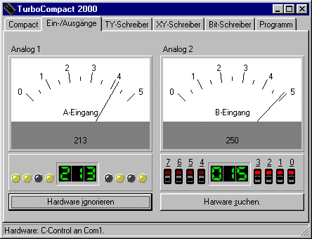 Beim Start von Compact wird nach bekannter Hardware gesucht. Wird keines der unterstützten Interfaces gefunden, so wechselt Compact in den Simulationsmodus. Alle Eingangswerte ändern sich sehr langsam. Mit Hardware ignorieren wird dieser Modus erzwungen. |
