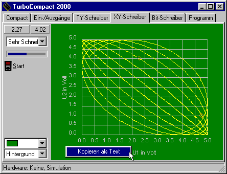 Mit bis zu 32000 Messpunkten können die beiden Analogeingänge und deren Abhängigkeit graphisch erfasst werden. Der Schreiber lässt unterschiedliche Messgeschwindigkeiten zu, so dass auch extrem langsame Änderungen erfassbar sind. Die Spannungen werden zusätzlich numerisch angezeigt. Alle Farben können entsprechend den Wünschen
