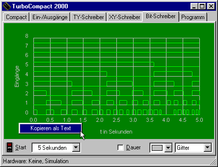 Der Bit-Schreiber stellt die zeitliche Abhängigkeit der Digitaleingänge als Impulsdiagramm dar. Auch hier kann die Messdauer zwischen 1 Sekunde bis 24 Stunden eingestellt werden. Alle Farben können entsprechend den Wünschen