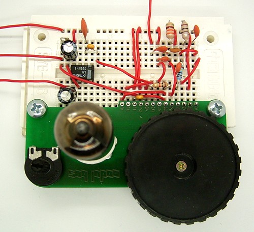 aufgebaut. Die Platine trägt die Röhre, einen Doppeldrehko und