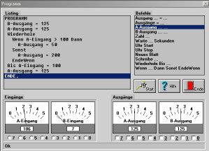 PROGRAMM B-Ausgang = 125 A-Ausgang = 125 Wiederhole Wenn A-Eingang > 100 Dann A-Ausgang = 50 Sonst A-Ausgang = 200 EndeWenn Bis A-Eingang = 100 A-Ausgang = 125 ENDE.