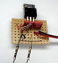 Durch Anpassung des Widerstands R kann auch eine andere Spannung eingestellt werden. Mit R = 240 Ohm ergibt sich eine Ausgangsspannung von 2,5 V. Vor dem Anschluss eines Supercap sollte man die Ausgangsspannung messen, um Fehler zu vermeiden. |