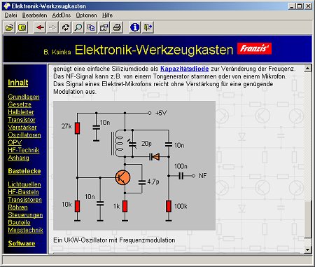 Die CD enthält den Franzis-Offline-Browser, der nach dem Einlegen in das Laufwerk automatisch startet. Alle Inhalte sind im HTML-Format verfasst und können daher auch mit Netscape oder dem Internet-Explorer angesehen werden. Allerdings erlaubt der Franzis-Browser ein direktes Starten von EXE-Programmen auf der CD. Dies ist nützlich beim Start von Elektronik-Simulationsprogrammen, die sich in großer Zahl auf der CD befinden.