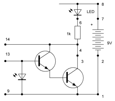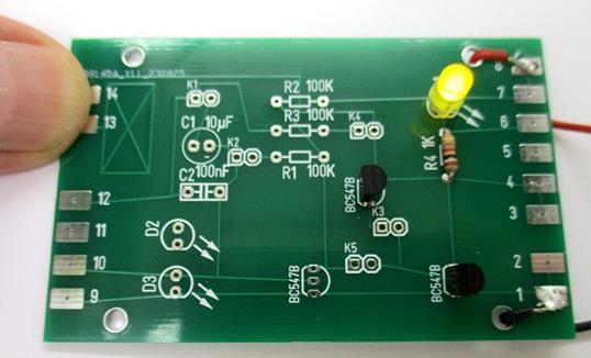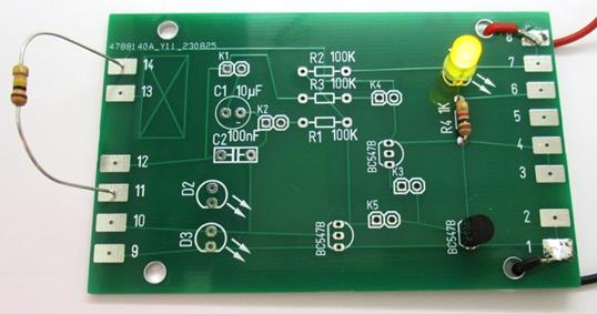 Nach dem Anschließen einer Batterie bleibt die LED zunächst aus, weil der Stromkreis noch nicht geschlossen ist. Erst mit einer Drahtverbindung zwischen Anschluss 2 und 3 geht die LED an. Später soll der rechte Transistor BC547B die Verbindung herstellen. Testweise kann der Kontaktdraht auch mit derselben Wirkung in die äußeren Lötlöcher für diesen Transistor gesteckt werden.