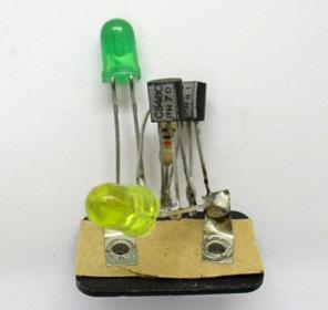 Der Lichtsensor ist so einfach, dass man ihn auch frei verdrahtet aufbauen kann. Hier wurde ein Batterieclip aus einer verbrauchten 9-V-Batterie ausgebaut. Er diente nun als Träger für die Schaltung. Sie kann direkt auf eine Batterie aufgesteckt werden.