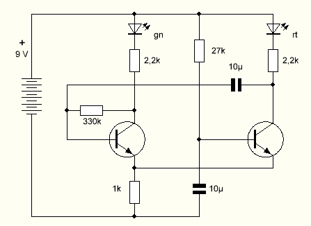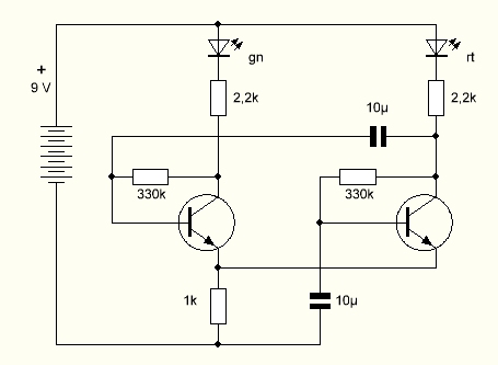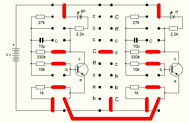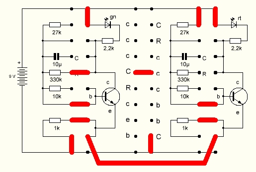 Und noch ein Umbau: Der rechte Transistor verliert seinen Basiswiderstand. Ersatz schafft eine Berührung der Kontakte mit dem Finger. Nun kann man durch mehr oder weniger starke Berührung die Schwingungen beeinflussen.