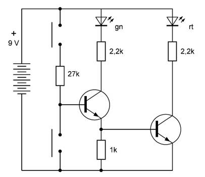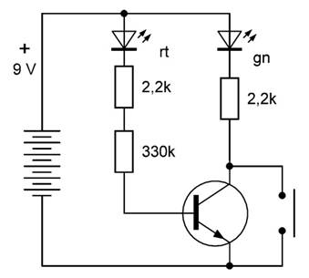 Bei einer Alarmanlage kommt es darauf an, dass sie den Alarm sehr deutlich anzeigt und dass die Batterie möglichst lange hält. Diese Schaltung leistet beides. Durch den großen Basiswiderstand von 330 kΩ wird nur ein sehr kleiner Ruhestrom von rund 20 µA gebraucht. Und dieser kleine Strom fließt auch durch die grüne LED, die dauernd schwach leuchtet. Damit hat man zusätzlich eine Bereitschaftsanzeige. Aber wenn die Drahtbrücke entfernt wird, reicht der Strom für eine große Aussteuerung des linken Transistors aus, der dann gleichzeitig auch den rechten Transistor einschaltet. Im Alarmfall leuchten also beide LEDs hell auf.