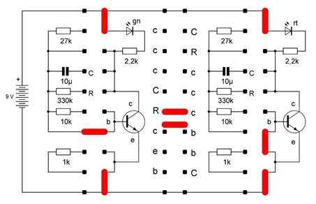 „Kurzschluss“ hört sich gefährlich an, aber in diesem Fall besteht keine Gefahr, weil der Strom durch den Basiswiderstand begrenzt wird. Man sieht auch ein schwaches Leuchten der roten LED. Wenn der Kontakt geöffnet und geschlossen wird, ist kaum ein Unterscheid zu bemerken. Nur die rote LED reagiert. Bei offenem Kontakt leuchtet sie mit voller Helligkeit und zeigt den Alarm an.