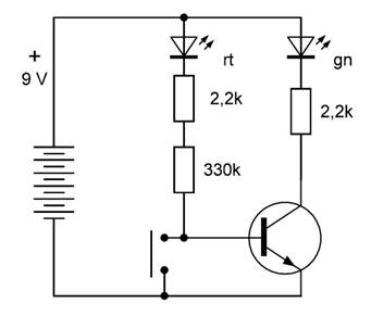 Jetzt wird der Basiswiderstand auf 330 kΩ vergrößert. Damit man sehen kann, wie klein der Basisstrom ist, soll die rote LED ihn anzeigen. Und tatsächlich, die grüne LED leuchtet sehr hell, die rote nur ganz schwach.
