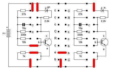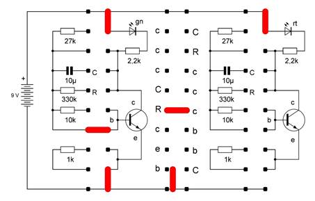 Damit diese Verbindung mit Jumpern möglich ist, muss man einen Umweg über den rechten Transistor nehmen. Dessen Basis und Emitter werden nach Minus verbunden. Dann kann ein Jumper zwischen c (links) und b (rechts) auf der mittleren Kontaktleiste die Verbindung schließen. Der Kollektor des linken Transistors wird also mit dem Minuspol verbunden. Aber wird die LED dadurch noch heller? Nein! Das Ergebnis lautet also, dass der Transistor allein schon ein sehr guter Schalter ist.