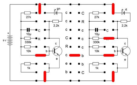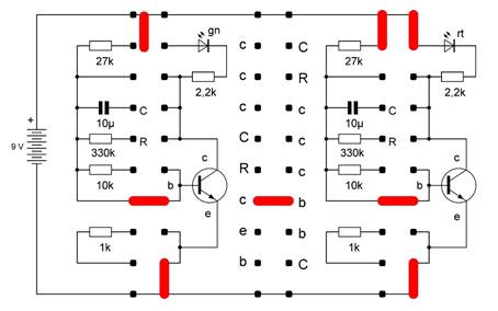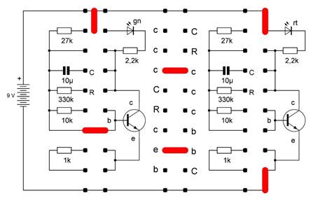 Mit einer Berührung konnte bisher schon eine LED eingeschaltet werden. Aber es geht auch anders herum. Nun soll die LED im Ruhezustand an sein, aber ausgehen, wenn man die Kontakte berührt. Die Aufgabe erinnert etwas an die Alarmanlage. Dort war die Lösung, die Basisspannung kurzzuschließen. Und diesmal ist es genauso, mit einem kleinen Unterscheid. Der Kurzschluss wird nicht durch einen Draht oder eine Steckbrücke erreicht, sondern durch den linken Transistor. Wenn er leitet, schaltet der den rechten Transistor ab.