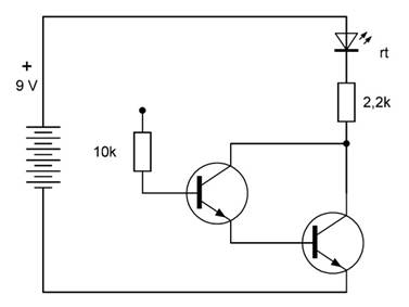 Eine LED leitet den Strom in Durchlassrichtung und sperrt ihn in Gegenrichtung. Aber wenn Licht von außen auf den LED-Kristall fällt, fließt auch in Sperrrichtung ein kleiner Strom. Er ist allerdings sehr viel kleiner als ein Mikroampere und wird meist überhaupt nicht bemerkt. Mit einer Darlingtonschaltung hat man jedoch so viel Verstärkung, dass der verstärkte Strom eine LED deutlich zum Leuchten bringt. Je heller es ist, desto heller leuchtet auch die rote LED.