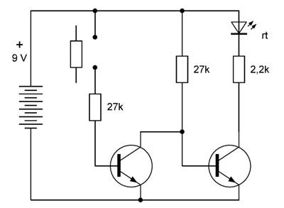 Eine andere Version dieser Schaltung legt den Basiswiderstand nicht an den Kollektor sondern an Plus. Diesmal wird der 27-kΩ-Widerstand verwendet. Auch durch ihn fließt im Aus-Zustand ein Strom, aber er fließt eben nicht durch die LED. Deshalb geht die LED diesmal vollständig aus. Aber weil der Strom durch den neuen Basiswiderstand wesentlich größer ist, braucht man auch einen größeren Sensorstrom am Eingang des ersten Transistors. Die Berührung muss also etwas niederohmiger ausfallen. Es kann sogar nötig sein, den Finger für den Versuch leicht anzufeuchten, damit die rote LED wirklich ausgeht.